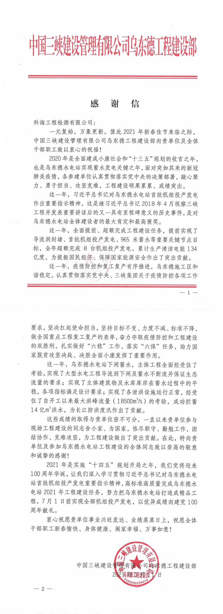中國三峽建設管理有限公司感謝信