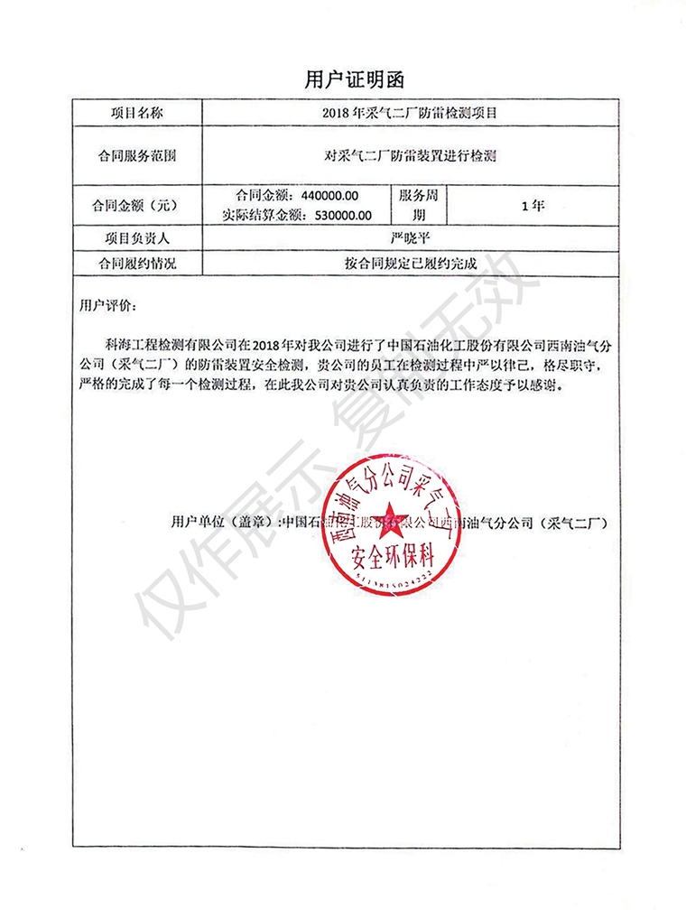 中石油西南油氣分公司用戶證明函